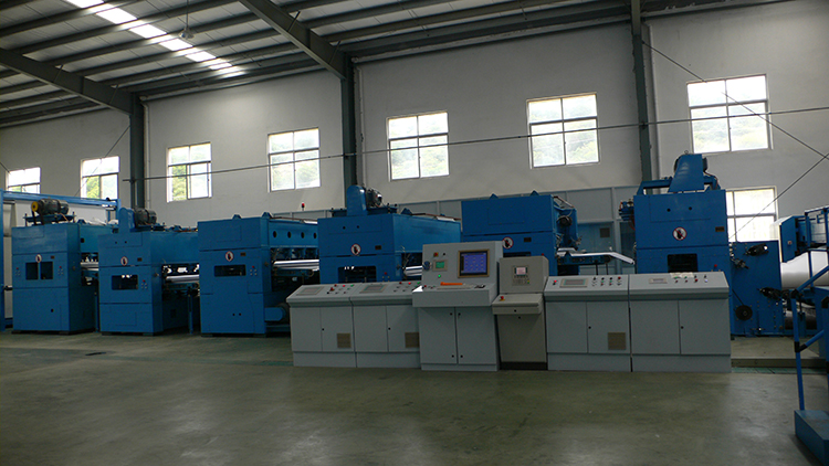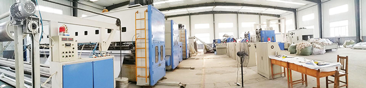 本生产线主要包括布边角料开松机、棉箱、梳理机、铺网机、针刺机、分切成卷机。采用服装厂、制鞋厂、被服厂等布边角料为原料,经开松、梳理成网、针刺、成卷而制成的具有一定拉力的纤维毡。该毡主要用于温室大棚保温,水产养殖、禽畜饲养,遮盖混凝土精制品,沙发、床垫内用衬布,汽车内饰用布,蒙古包防寒用门帘等。